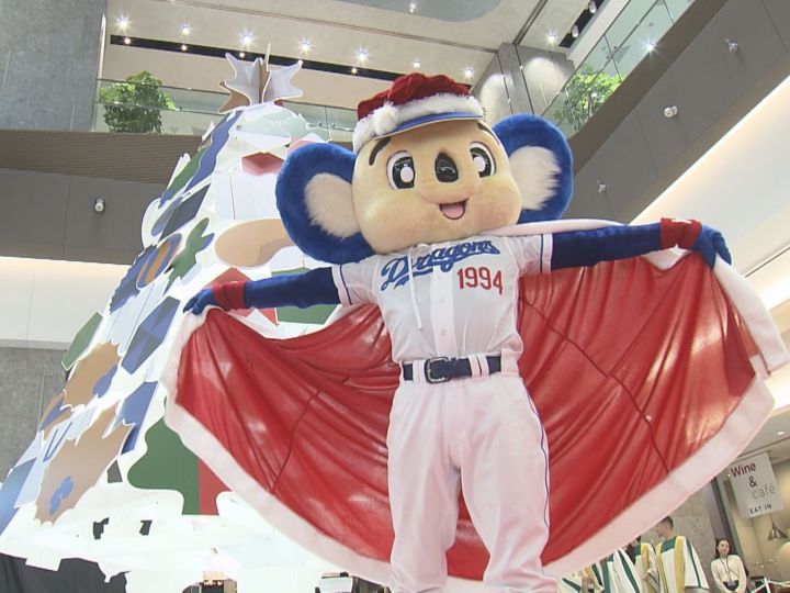 名古屋市中区の中日ビルで11月1日、中日ドラゴンズのマスコット、ドアラもサンタクロースの衣装で参加して、クリスマスツリーがお披露目されました。