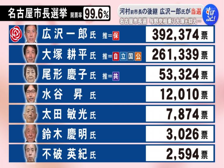 過去最多に並ぶ7人が立候補した名古屋市長選は、河村前市長から後継指名を受けた元副市長の広沢一郎さん(60)が、自民、立憲、国民、公明が推薦した大塚耕平さんらを破り当選を果たしました。