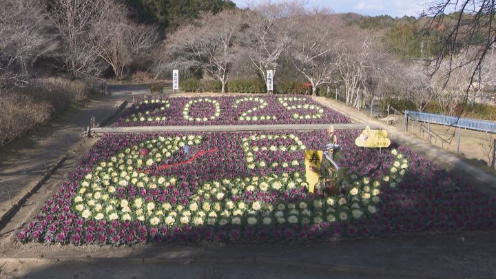 奥殿陣屋では毎年、干支をテーマにした葉牡丹のアートを製作していて、縦24メートル、横12メートルの花壇に、赤と白合わせて1223株を使って、「2025」の文字と大きなヘビの姿を描きました。