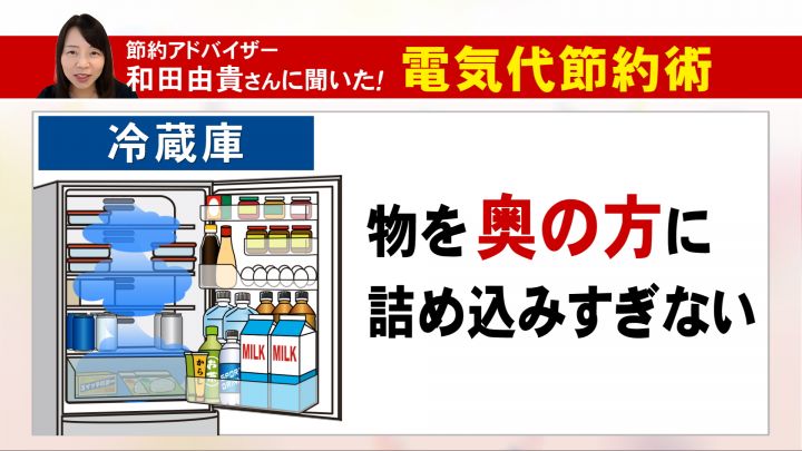 電気料金の節約のポイントは、消費電力の大きい冷蔵庫に「モノを詰め込みすぎない」ことです。