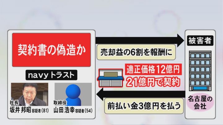警察によりますと、2人は知人の男性を土地の所有者に仕立て、名古屋の会社との商談で、土地の売却益の6割を報酬にするとウソの話を持ち掛けて21億円で契約し、前払い金などの名目でおよそ3億円をだまし取ったとみられています。