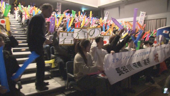 長谷川選手の地元・岩倉市ではパブリックビューイングが開かれ、同級生などおよそ500人が声援を送りました。