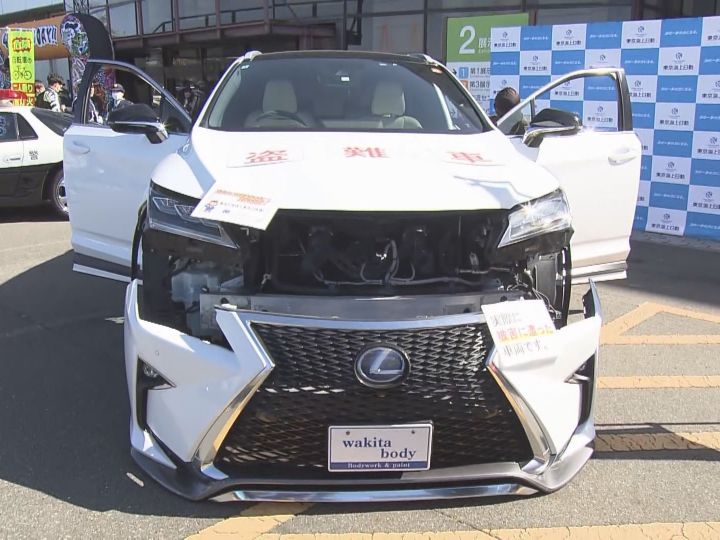 ボンネットに大きく書かれた「盗難車」の文字。14日、ポートメッセなごやで開かれたSUVの展示イベントの会場に置かれたレクサスRXは、6年前に愛知県内で盗まれ、長野県内で警察から追跡を受けて事故を起こしました。