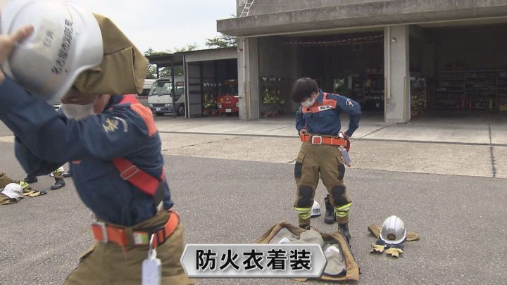 おっとりした性格の岩下さんですが、重さ10キロの「防火衣」の着装訓練でも男性に負けていません。