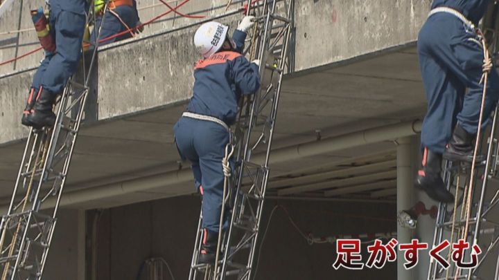 建物の2階のケガ人をはしごで救助する訓練では、はしごの途中で足がすくんでしまいました。