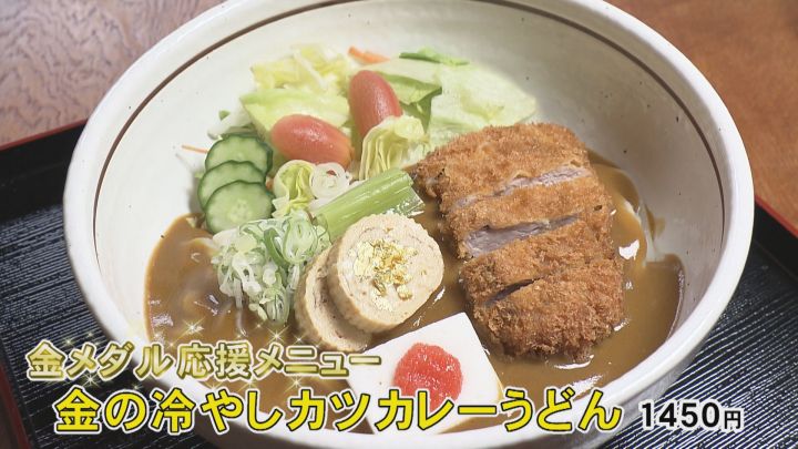 揚げたてのとんカツを、うどんと冷たいカレーの上へ。はんぺんと明太子で作った日の丸も…。“華麗に勝つ”との願いをこめた「金メダル応援メニュー」です。