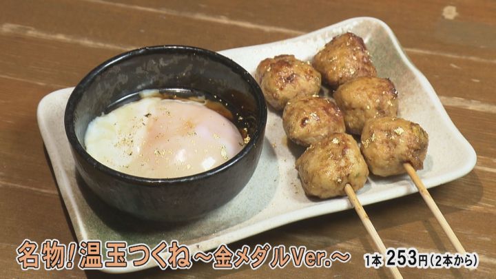 他の応援メニューは、つくねをメダルに見立てて贅沢に金粉をふりかけた「温玉つくね金メダルバージョン」に…。