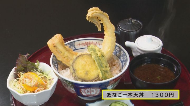 反り返ったアナゴを一本まるまる揚げた「あなご一本天丼」(1300円)。