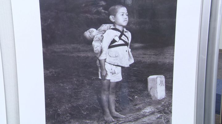 「(写真を指しながら)『焼き場の少年』。死んでいる自分の弟を焼いてもらおうと、焼き場へ連れてきた。直接不動の姿勢でもって。焼けたのを確認して、その場を去っていった」