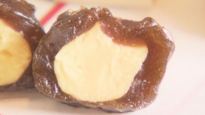 町の暗闇をコーヒー味のわらび餅で、灯りをカスタードクリームで表現しました。冷やして食べると固めのプリンのような食感です。