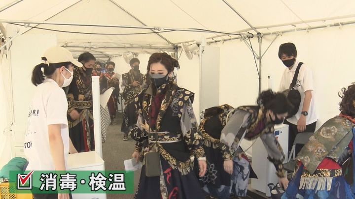 一方、久屋大通公園には、ステージの出演者が次々に到着。入場は1チームごとで手指の消毒と検温に加えて全身と靴裏まで徹底消毒。さらに2週間分の健康チェックシートを提出してやっと入場することができます。