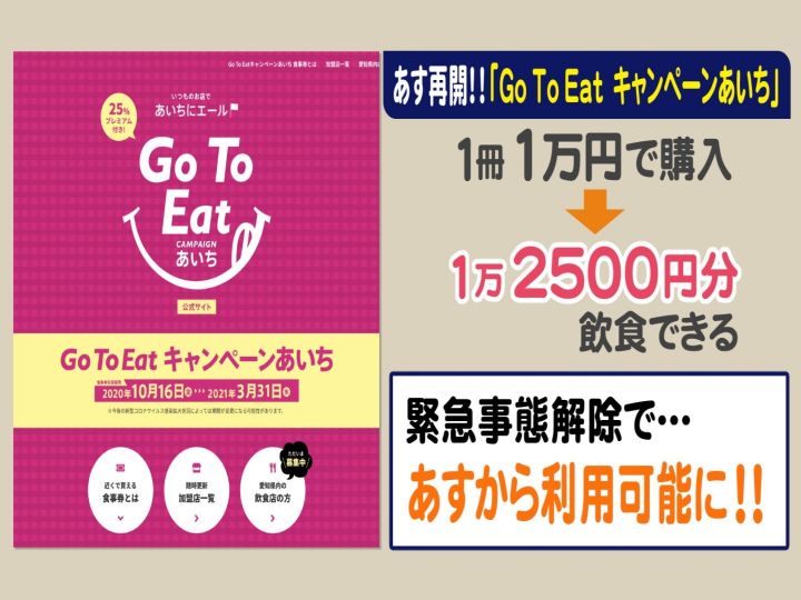愛知県では10月5日から「GoToイート」キャンペーンが再開します。