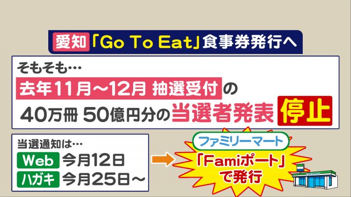もう一つ再開されるのが食事券の『発行』です。愛知のGoToイートは、2020年11月から12月に抽選を受け付けた第2期分、40万冊・50億円分の当選者の発表から停止していました。今回の再開に伴い、これまでに応募した人の中から、当選した人への通知が届けられることになります。