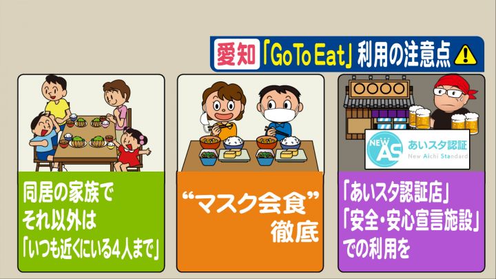同居する家族以外で利用する場合は「いつも近くにいる4人まで」。お店の中では食べる時にだけマスクを外す「マスク会食」の徹底。また、県の感染症対策のお墨つきをもらった「あいスタ認証店」などでの利用を呼びかけています。