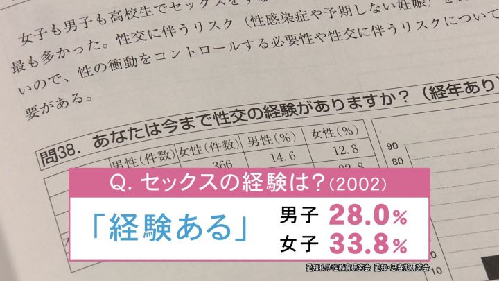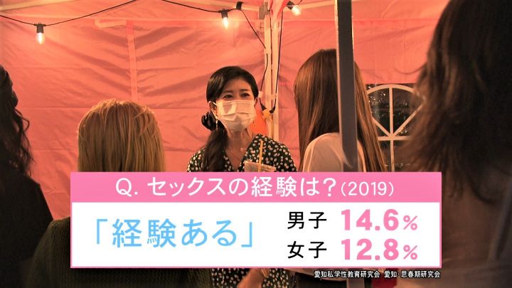 愛知私学性教育研究会らが2019年に県内の高校生およそ7000人に調査したところ、セックスの経験が「ある」と答えたのは男子が14.6%、女子が12.8%でした。
