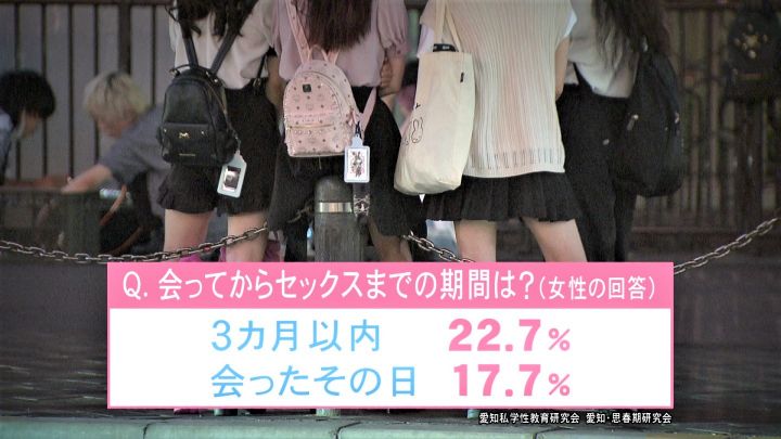 また知り合ってからセックスするまでの期間については、1か月から3か月が22.7%でしたが、会ったその日と答えた女子が17.7%もいました。ここから出会い方やプロセスの問題が見えてきます。