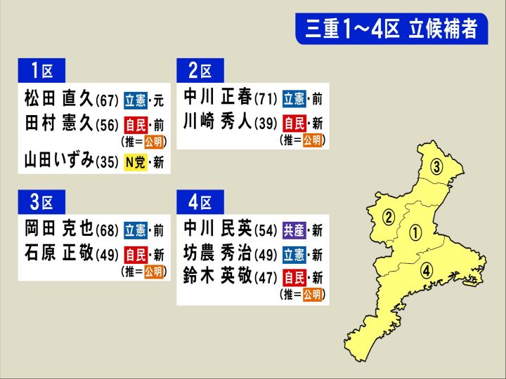 【衆院選 三重】4選挙区に10人が立候補 2区は自民前職の後継と立憲候補の一騎打ちに 2021/10/19 21:39配信 衆議院議員選挙は19日公示され、午後5時に立候補の受付が締め切られました。三重県では10人が立候補しました。 2区と4区では自民のベテランが引退し、それぞれ息子と前知事が後継の候補者になりました。 2区と3区は自民と立憲の一騎打ちです。 三重県では、4ある小選挙区のうち、3の選挙区で、立憲、共産、国民、れいわ、社民の野党5党が候補者を一本化しています。 自公政権の批判の受け皿となれるか、注目されています。