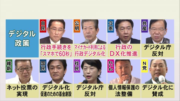 衆院選でも、行政のデジタル化については、自民党が「行政手続きを『スマホで60秒』」、公明党が「マイナンバーカード利用による行政デジタル化」、立憲民主党が「行政のDX化推進」と、3党が公約で掲げています。