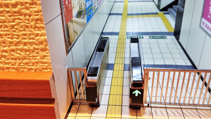 改札機、壁の広告、そして奥の列車までホンモノにしか見えない。
