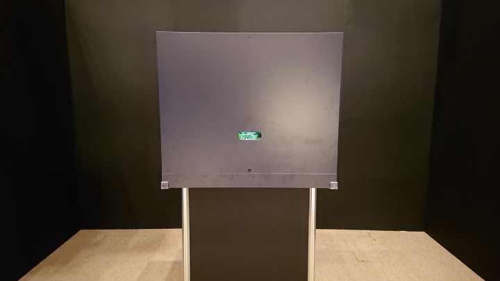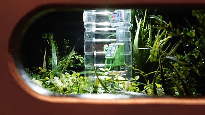会場の中にある大きな箱に設けられた「穴」を除くと、一面に草木が生い茂る中に、2リットルサイズのペットボトル。