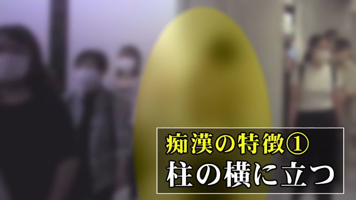 まず目をつけたのは、満員のホームで柱の陰に立ちスマホをいじる男性。痴漢の特徴として、立ち止まってターゲットを探すため柱付近に立つことが多いといいます。しかし、後ろから様子を伺うと…。