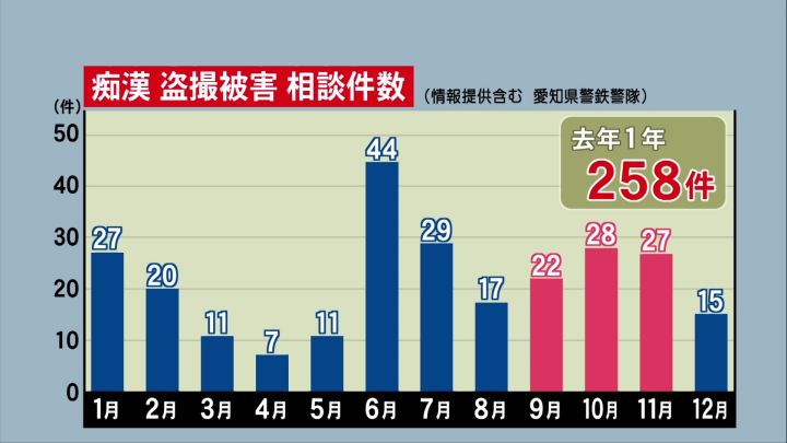 女性を狙う痴漢行為や盗撮行為など、2021年に愛知県警鉄道警察隊に寄せられた相談件数は258件にのぼります。