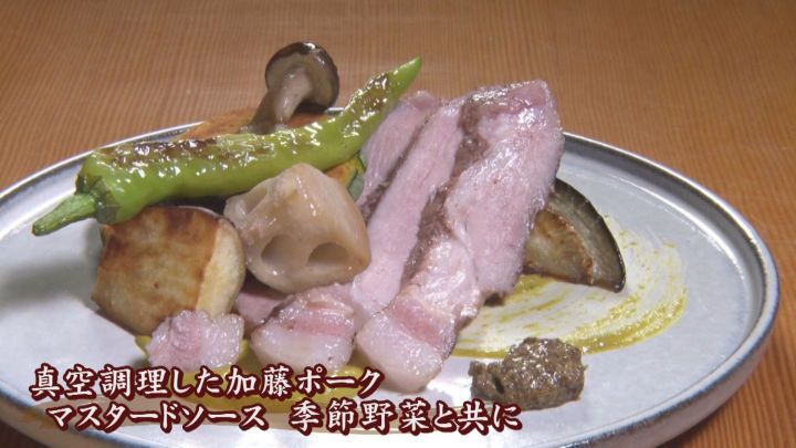 群馬県産のブランド豚を焼き上げた「真空調理した加藤ポーク マスタードソース 季節野菜と共に」は、余分な脂がなくさっぱりと食べられます。