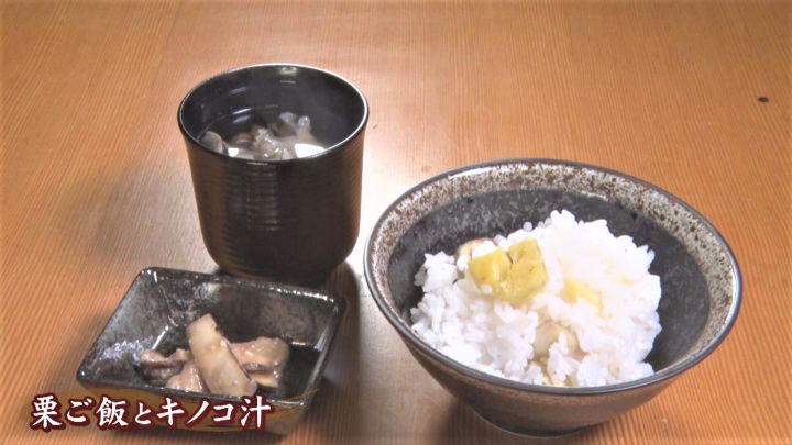 シメには、秋を感じる「栗ご飯とキノコ汁」。つけ合わせは、「マツタケ信州みそ和え」です。