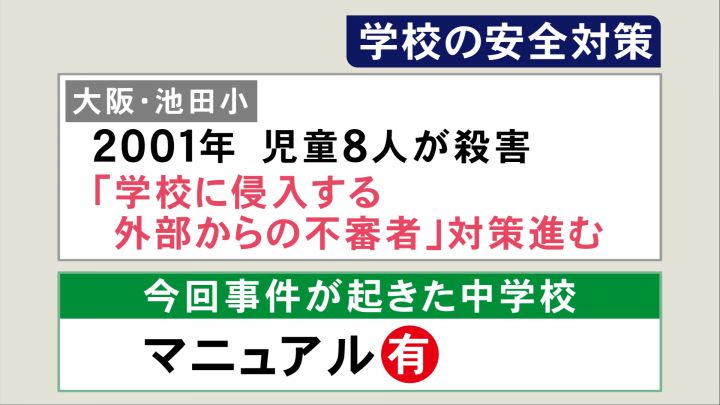今回事件が起きた弥富市の中学校でも、不審者の対応についてマニュアルを策定していましたが、生徒が刃物などを持ち込むことは想定していませんでした。