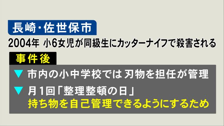 そうした中、長崎県佐世保市で2004年、小学校で小学6年の女児が同級生にカッターナイフで殺害される事件があり、その後、市内の小中学校でははさみやカッターナイフ、それに彫刻刀などの刃物は担任が管理するようになりました。