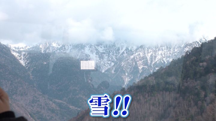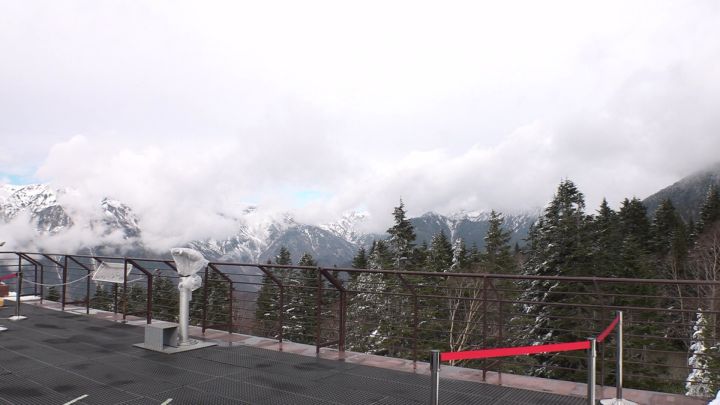 ロープウェイで上がること7分…。車窓から見える北アルプス「西穂高岳」の山肌には、白い雪が見えました。