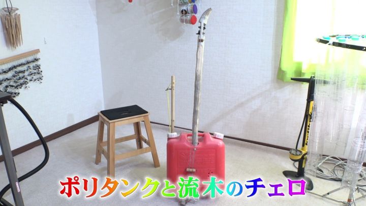 新作は、海に捨てられていたポリタンクと流木で作ったチェロ。
