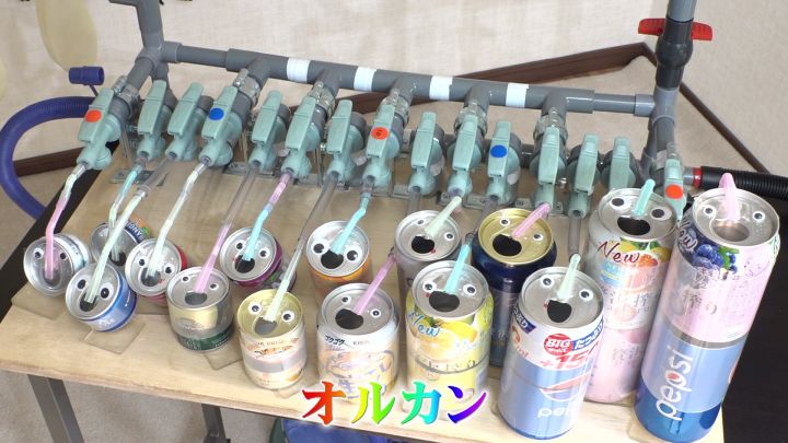 パイプオルガンの仕組みを取り入れた「オルカン」は、足踏みポンプで風船を膨らませ、そこから出る空気を農薬散布に使われるバルブを通して空き缶の飲み口に噴射することで、軽やかな音色を奏でます。