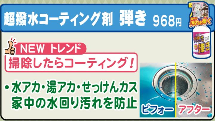 小早川さんのおススメは「超撥水コーティング剤 弾き」。こちらはフッ素樹脂とシリコーンの力を利用した、水周り用のコーティング剤です。水アカ・湯アカ・石鹸カス等の汚れを防止し、カビ発生防止にもなるため、浴室、キッチン、トイレと、家中をコーティングできます。