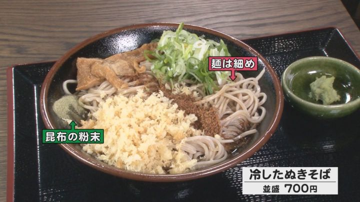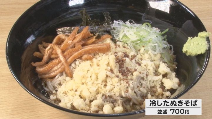 この店の「冷したぬきそば(並盛)」(700円)は、刻んだ油揚げにそばの実がトッピングされていました。