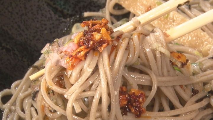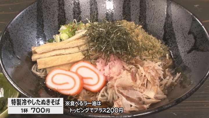 ■そばに自家製ラー油を絡めて…個性的な居酒屋の“冷やしたぬき”