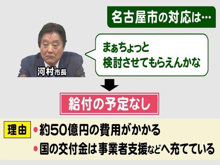 市の担当者によりますと「今のところ給付の予定はない」ということです。その理由について、所得制限で給付金を受け取れない子育て世帯に給付するとなると、名古屋市では50億円余かかるということで、捻出することが難しいとしています。