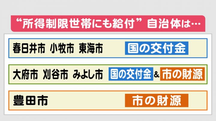 財源はさまざまで、春日井市などは国の「地方創生臨時交付金」を、大府市などは交付金と市の財源の合わせ技で対応をする方針で、豊田市は全額市の財源でまかなう予定ということです。
