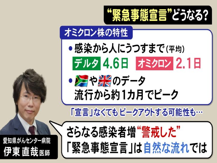 オミクロン株の特性として、感染してから人にうつすまでの時間がデルタ株より短いことや、南アフリカやイギリスのデータでは、流行から1カ月ほどでピークを迎えていることなどから、宣言など厳しい措置をとらなくてもピークアウトする可能性はあると分析しています。