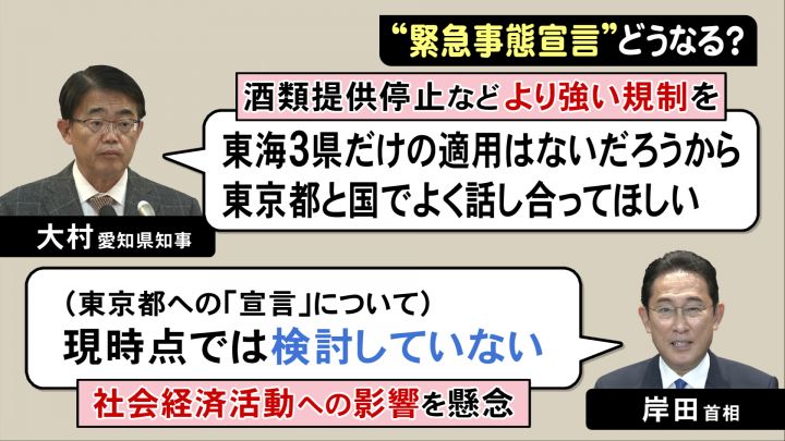 愛知県の大村知事は引き続き飲食店の酒類提供停止など、より強い規制の必要性を唱えています。東海3県だけの適用はないとみていて、感染者の多い東京都と国で「宣言」を出すかよく話し合ってほしいとしています。