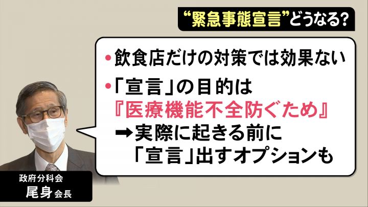 そして、緊急事態宣言の目的は「医療機能不全を防ぐため」と説明し、「医療機能不全が発生する前に出すオプションもあり得る」とタイミングについても見解を示しました。