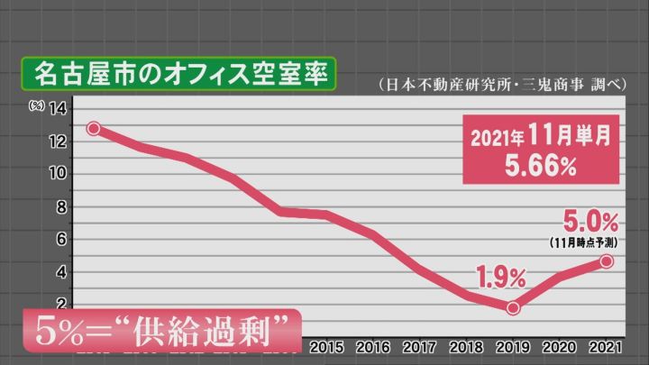 オフィスの空き状況を示す名古屋の「空室率」は、リーマンショック直後の2010年に12パーセントを超えたものの、その後は徐々に改善。2019年には1.9パーセントまで下がっていました。ところが、コロナの感染拡大とともに再び上昇。2021年11月には“供給過剰”とされる5パーセントを上回っています。