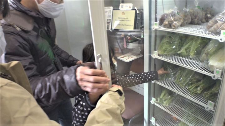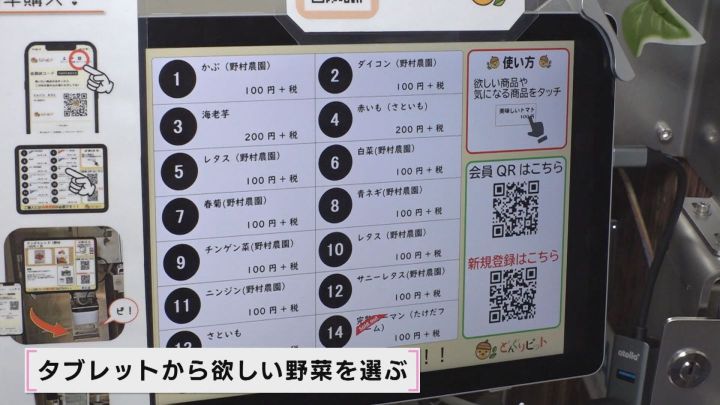利用者は事前にスマートフォンで登録し、冷蔵庫の隣に設置されたタブレットで欲しい商品をタッチ。スマートフォンに表示されたQRコードをかざして決済すると野菜を受け取ることができます。