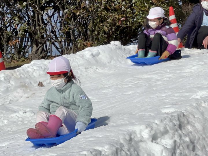 午後1時半からは町内にある3つの保育園の園児およそ80人が集まり、晴れ空の元、雪の滑り台を楽しんでいました。