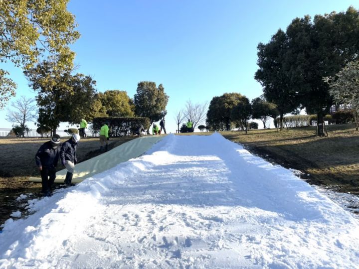18日は午前6時半ごろ、10tトラック5台分の大量の雪が豊山町の名古屋空港近くにある神明公園に届けられ、町内の建設会社や北名古屋市の建設業協会が協力し、2つの雪の滑り台を作りました。