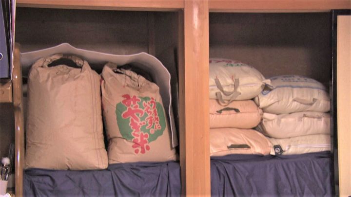 寄付で集めた40組の布団を用意。また、主食となる米は、5~6年保存できるモミや玄米として蓄えています。