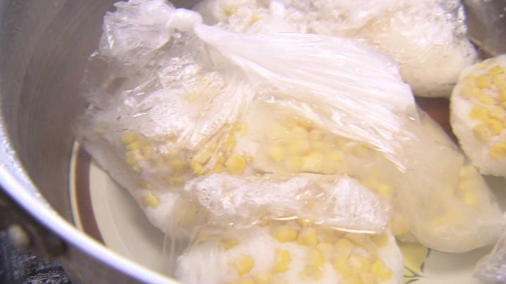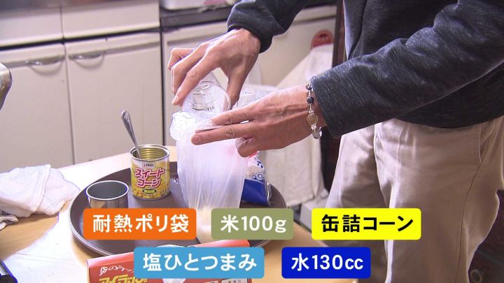 調理師である末永さんは、どこの家庭にもあり長期保存ができる食材で、簡単にできる非常食を作ってくれました。耐熱のポリ袋に、米100グラムと缶詰めのコーン、塩ひとつまみ、水を130cc入れて20分ゆでれば、コーンライスの完成です。