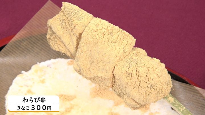 食べ歩きしやすいようにカップに入れた「カップわらび」(きなこ 380円 抹茶 420円)や、串に刺してイカせんべいに乗せた「わらび串」(きなこ 300円)など、大須らしいスタイルにしました。
