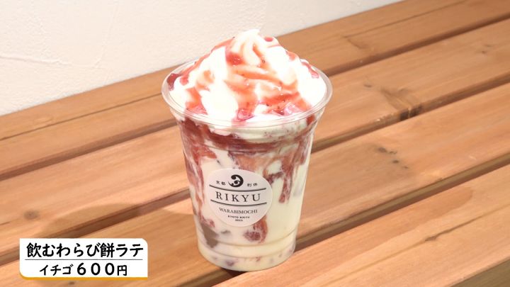 2月10日にオープンした「京都利休の生わらび餅」では、パックに入った「生わらび餅」(小 600円)をはじめ、カップのわらび餅に生クリームをトッピングした「飲むわらび餅ラテ」(イチゴ 600円)など、個性的な商品を販売しています。
