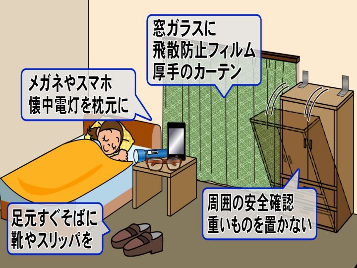 タンスやテレビといった重いものは、寝ている場所の近くに置かないようにしましょう。